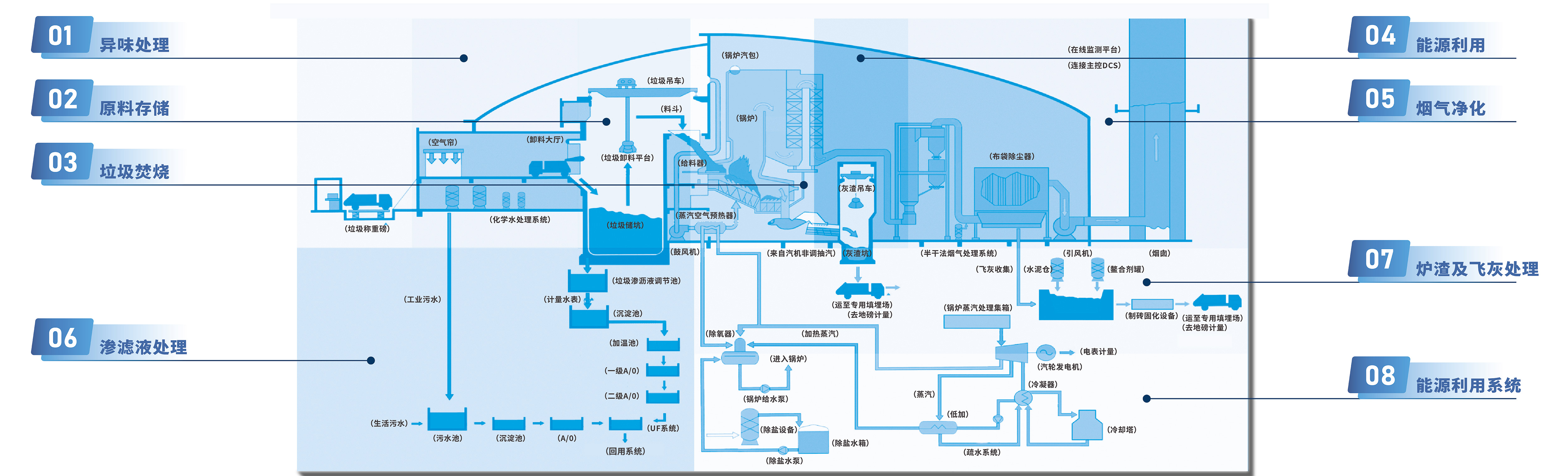 盈峰環(huán)境生活垃圾焚燒發(fā)電處理模式將全流程劃分為八大模塊,構(gòu)建囊括垃圾入庫(kù)、儲(chǔ)存、焚燒,煙氣凈化、滲濾液處理、爐渣及飛灰處理、熱能產(chǎn)生、能源利用的八大系統(tǒng)。